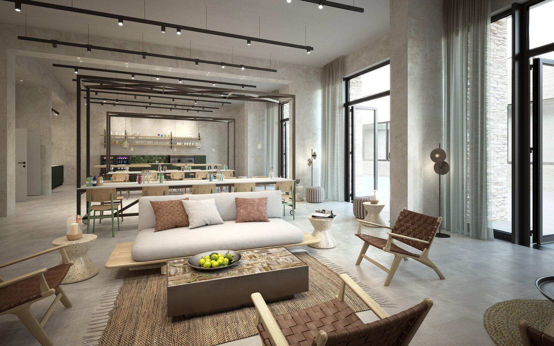– Bepflanzung der Freiräume mit 3D-Geometrien, Positionierung von Möbeln und Accessoires