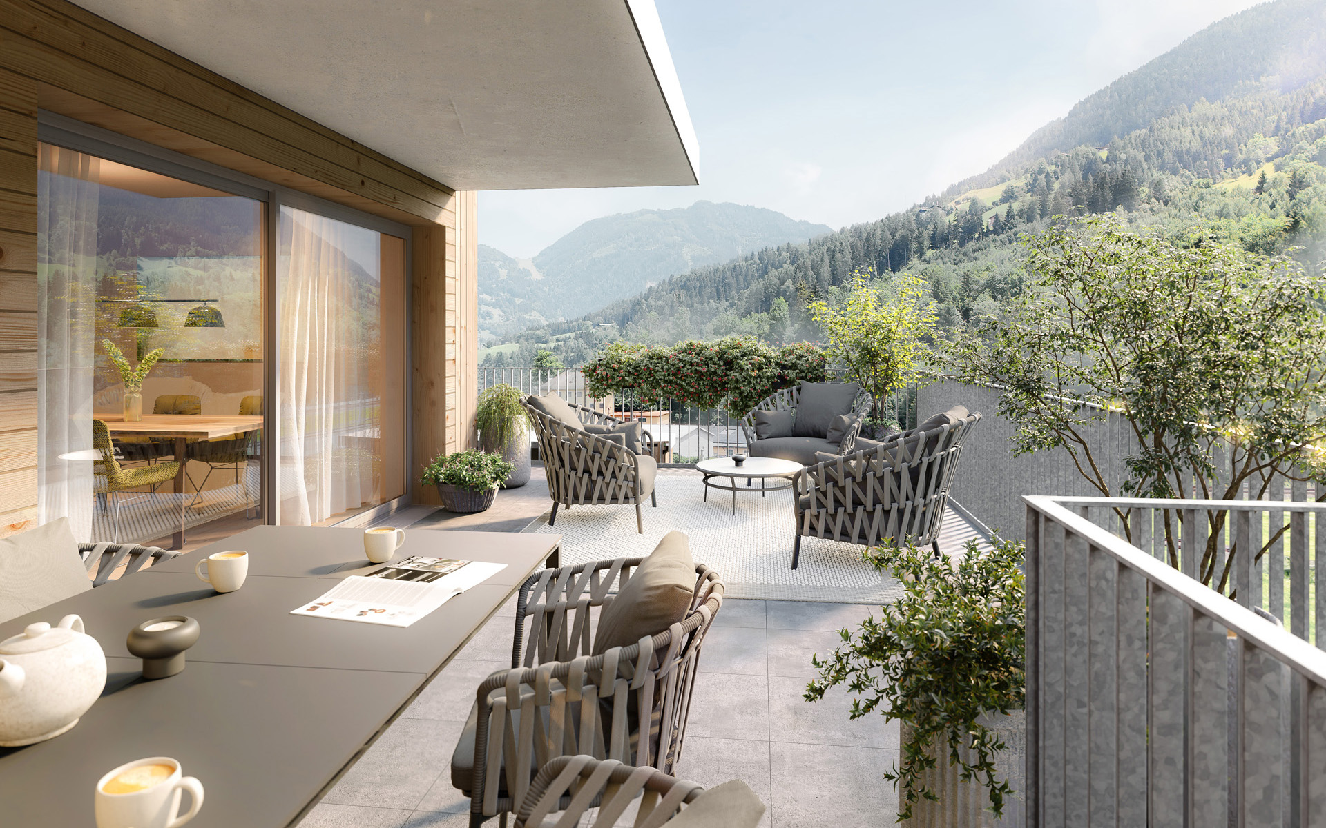 – Bepflanzung der Freiräume mit 3D-Geometrien, Positionierung von Möbeln und Accessoires